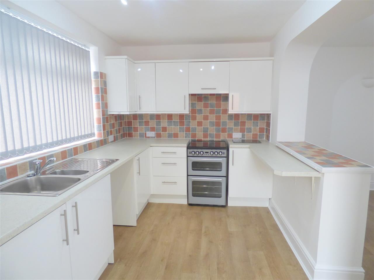 Fitted with a range of matching wall and base units with complimentary work surfaces, breakfast bar, freestanding cooker and extractor hood. Laminate flooring, plumbing for a washing machine, window to the rear aspect and door leading to the rear garden.