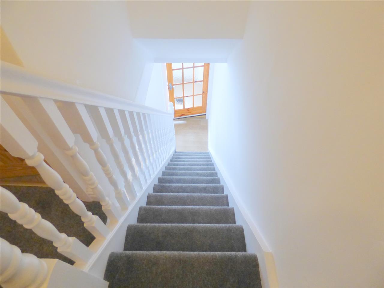 Laminate flooring with radiator, window to the front aspect and stairs leading to the first floor.