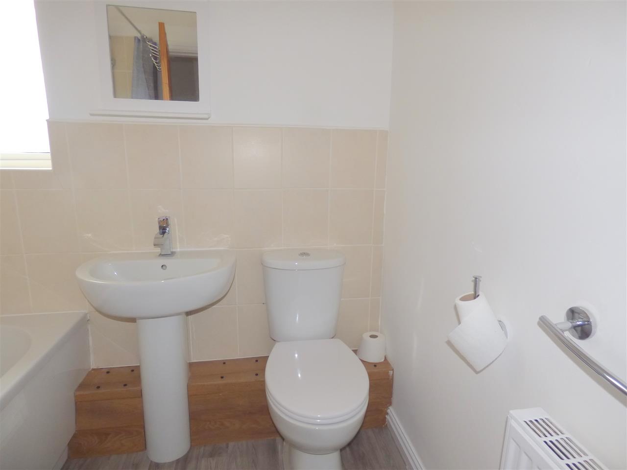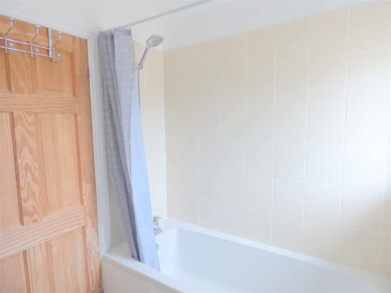 Vynil flooring with white three piece bathroom suite with over the bath shower. Radiatior and window to the rear aspect.