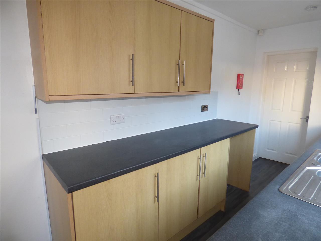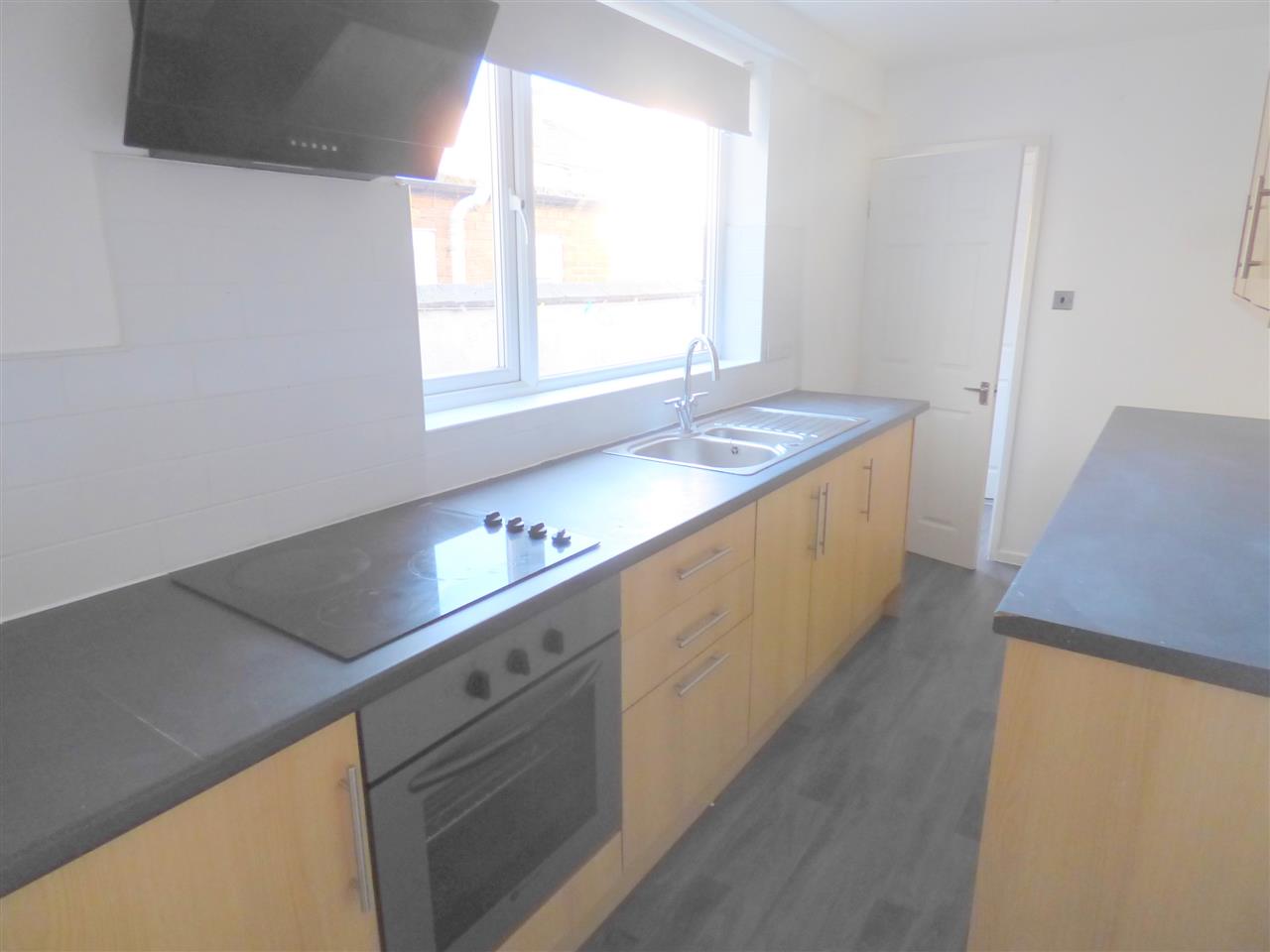 Fitted with a range of wall and base units with contrasting work surfaces. Electric hob, oven and extractor fan. Plumbing for a washing machine, vynil flooring and window to the side aspect.